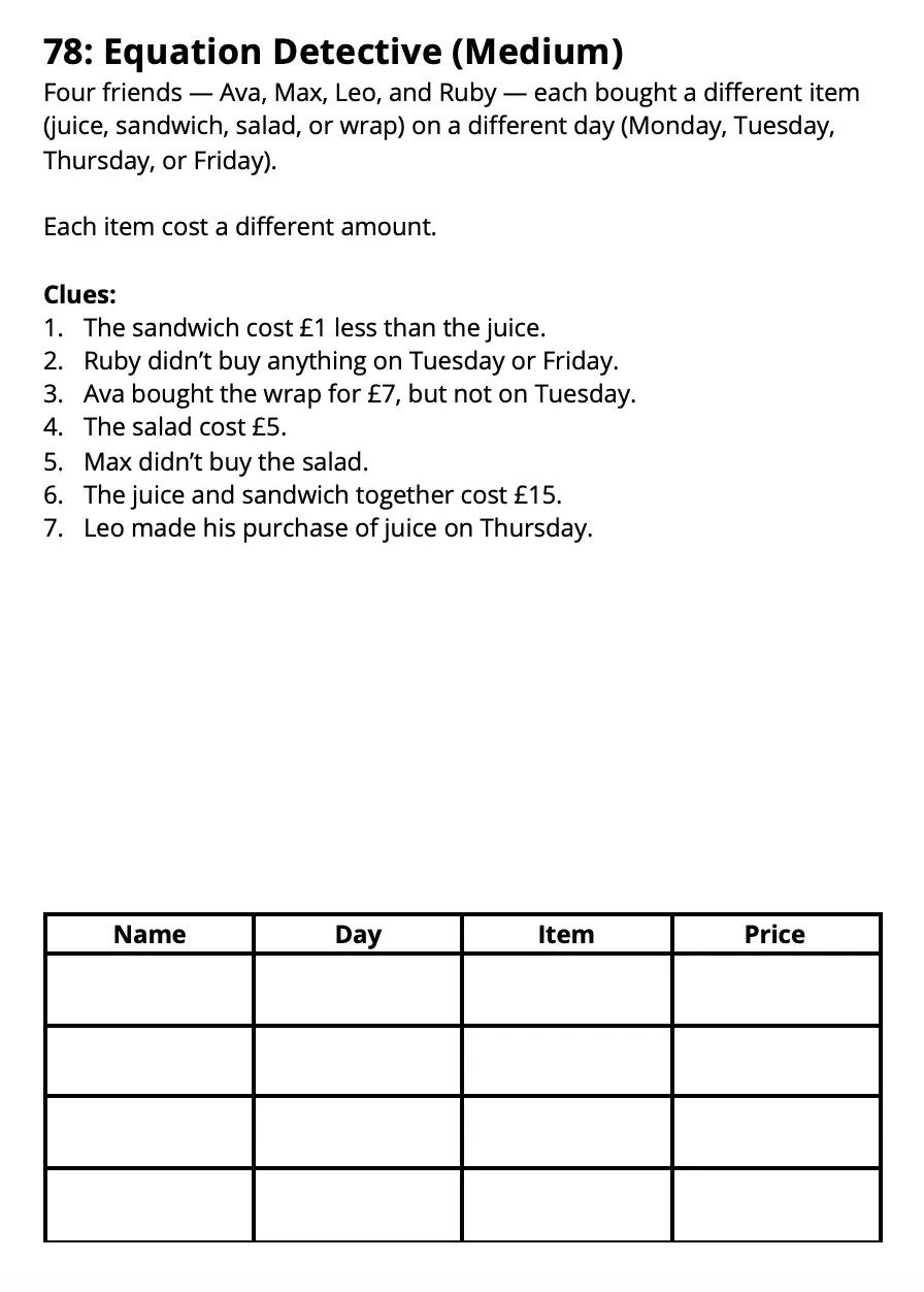 Equation Detective is a logic puzzle where you infer who bought what, when, and for how much by translating verbal clues into simple equations and inequalities. You fill in a grid of people, items, days, and prices to crack the case.