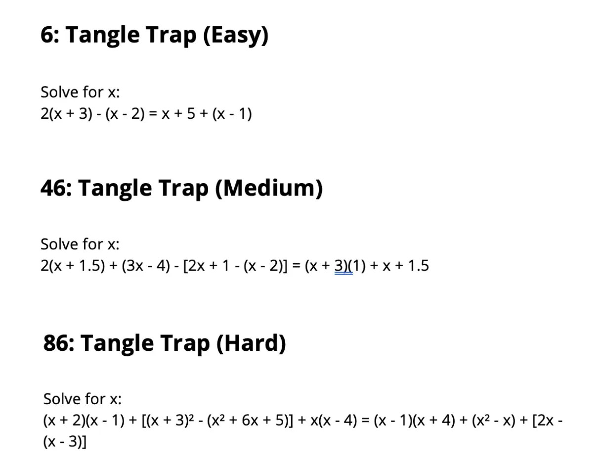 By “untangling” the brackets, combining like terms, and moving everything to one side, you reduced a seemingly complex expression down to the value of x. That’s the power of a Tangle Trap!