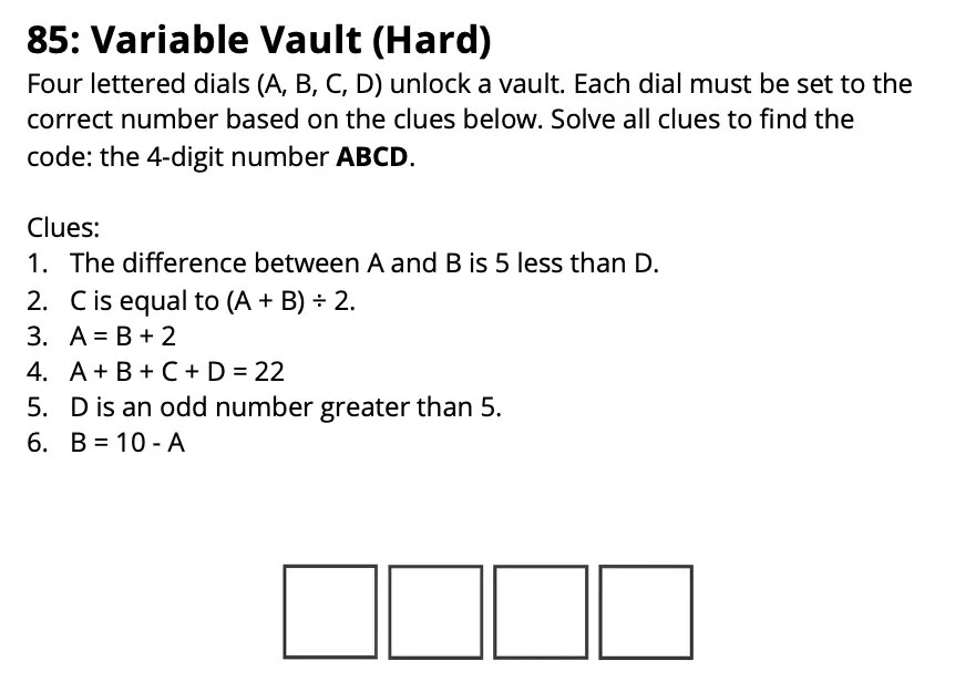 Variable Vault turns a set of verbal or numeric clues into a short system of equations – each variable (A, B, C, D) corresponds to a vault digit.